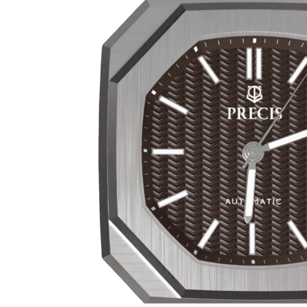 The case features an original geometric form designed in-house at PRECIS, with a design patent currently pending. Its multi-faceted architecture creates a distinctive profile defined by clean lines, sharp transitions, and a strong interplay of angles. With a 45 mm lug-to-lug span, the case achieves a balanced presence on the wrist while emphasizing its bold, contemporary shape.